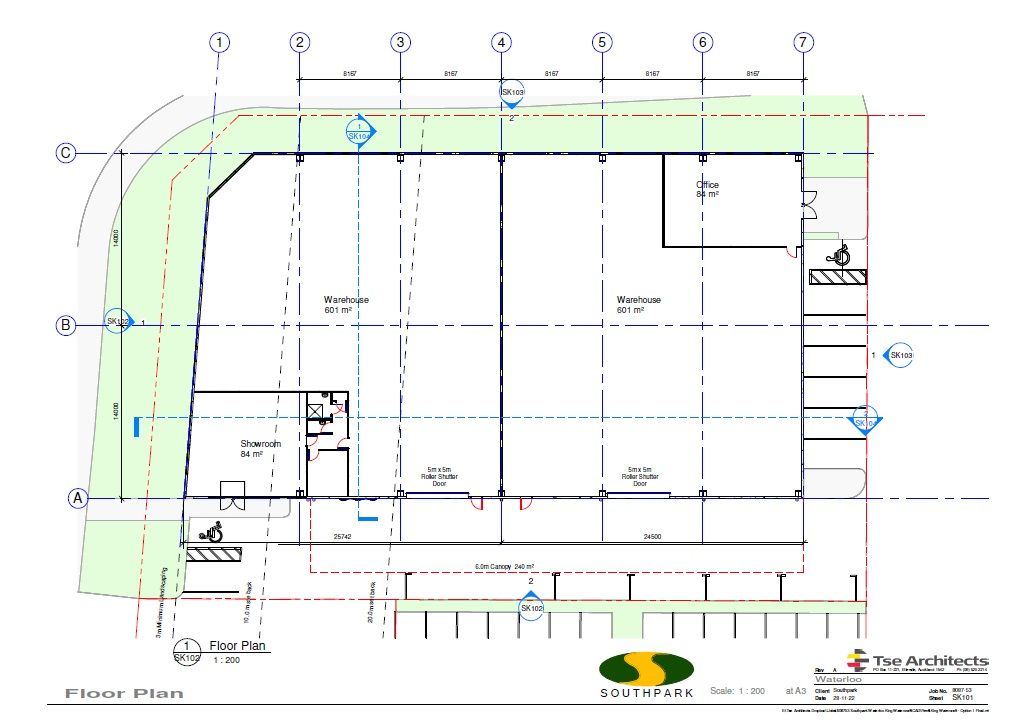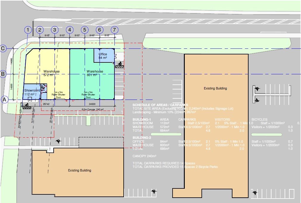 To be built, large warehouse/showroom/office building with a total area of 1,369m2* plus canopy of 240m2* that could be possibly split into two units. The first unit could have a warehouse of 572m2* and showroom of 112m2* (total 684m2*). The second unit could have a warehouse of 601m2* and office of 84m2* (total 685m2*). At this preliminary stage it may be possible to alter areas to suit your needs. Approx. completion of this new building(s) is late 2024.