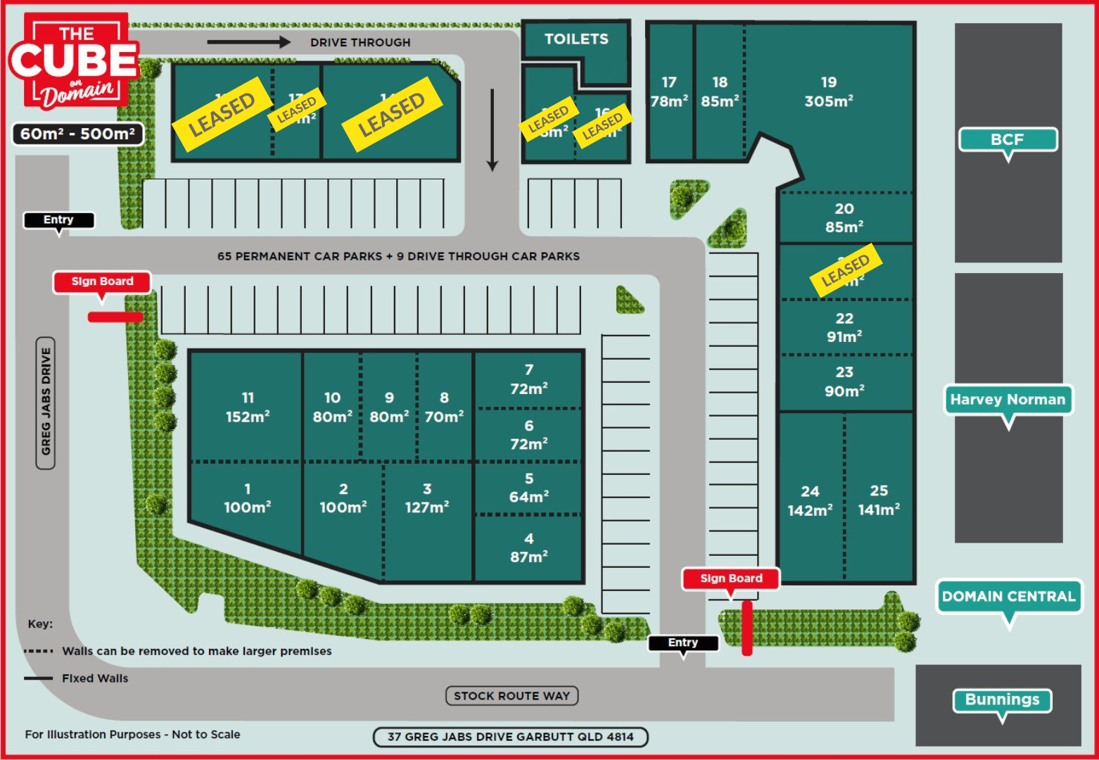 Tenancy areas from 60 sqm to 500 sqm are available.
