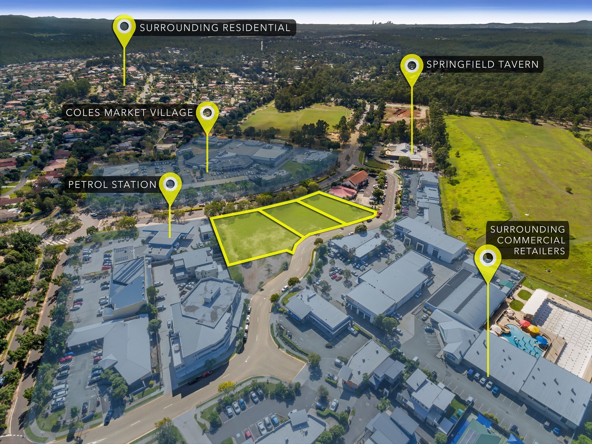 - Double street exposure via Commercial Drive and Springfield Parkway and potentially double street ingress and egress access from Springfield Parkway (DA needed via Ipswich City Council) - The subject site is heavily surrounded by various high traffic retailers and has ease of entry points to the site. This includes close proximity to Coles market village, Tradelink, Reece Plumbing (DA period), St Vinnies, BWS, United Petrol Station and walking distance to Springfield Tavern.
