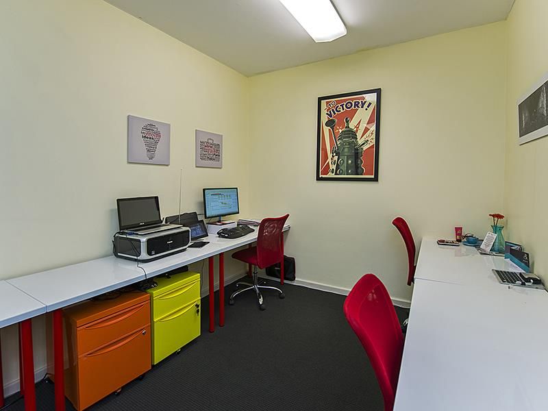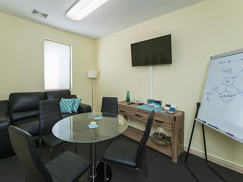 Light and bright 50sqm partitioned office including reception, two offices, kitchenette, and meeting room.